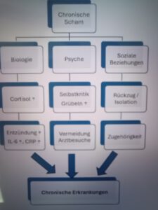 dass es eine diagnostizierbare Krankheit gibt aber trotzdem Schmerzen da sind. Und hier in diesem Diagramm kann man mal so sehen, wie das Ganze zusammenhängt. Da gibt es nämlich einmal so einen biologischen Prozess, einen psychischen Prozess und den sozialen Prozess denn das hat ja auch ganz viel mit Beziehungen zu tun. Warum? Die Kombination für den Verlust des Ansehens einer Person, also andere könnten mich negativ beurteilen, ich könnte mein Gesicht verlieren, ich könnte mich blamieren, verbindet sich noch mit der Unkontrollierbarkeit der Situation. Ich habe darauf keinen Einfluss oder sehr wenig. Eine dauerhafte Erkrankung des Immunsystems fördert chronische Entzündugen im Körper und die kann dann eben auch zu chronischen Erkrankungen führen. Mit den Ergebnissen von diesen drei Studien, es gibt sogar noch viele andere, kann man sagen dass dauerhafte Scham chronische Beschwerden auslösen kann, die keine körperliche Ursache haben. Oder halt auch chronische Krankheiten fördern.